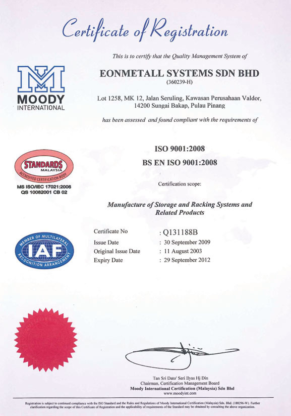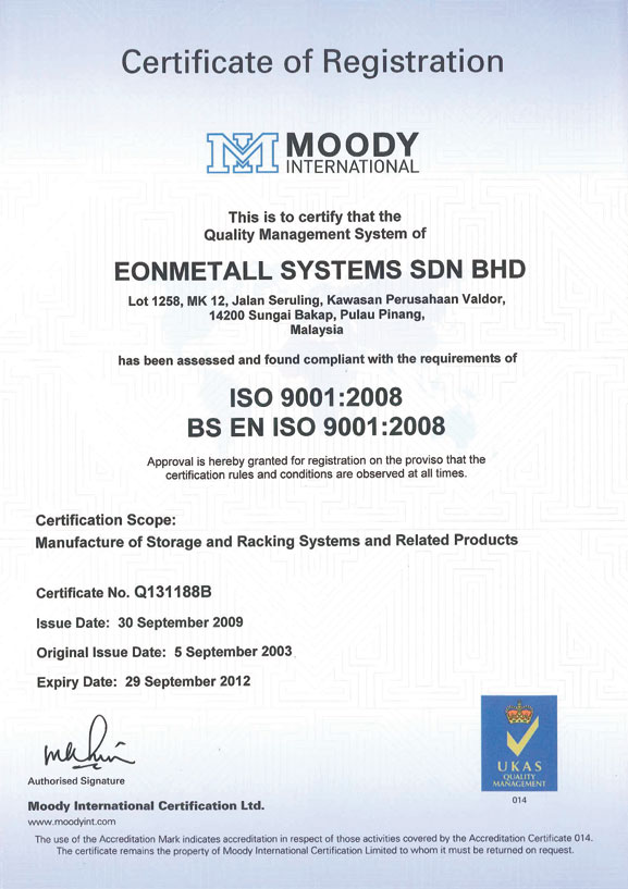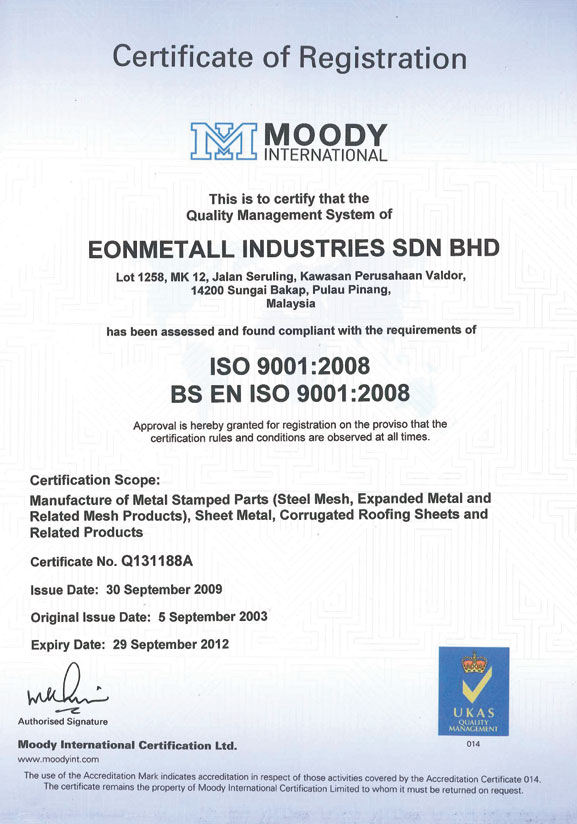Eonmetall has obtained the ISO9001:2008 certification that encompasses the quality policy and Eonmetall's commitment towards producing products of highest quality.